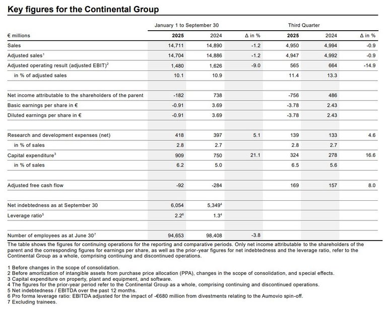 Continental’s operational performance in the third quarter of 2025 was affected by challenging market conditions driven by the general economic uncertainty. In this environment, the Tires group sector achieved good results and significantly improved compared with the second quarter of 2025, thanks to the strong replacement-tire business for passenger cars, particularly in North America and Asia. Despite weak industrial demand, ContiTech increased its adjusted EBIT margin year-on-year thanks to short-term cost-reduction measures. However, non-cash special effects from the Aumovio spin-off and the planned OESL sale overshadowed the otherwise solid operational performance in both EBIT and net income at group level.