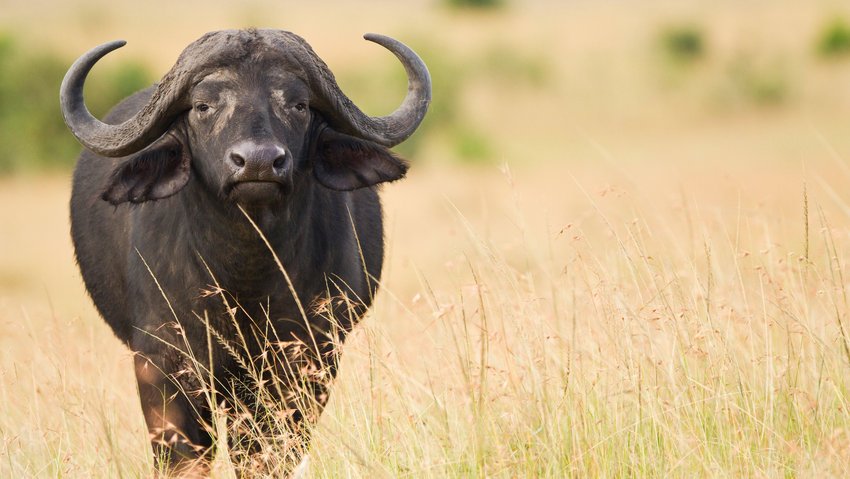 Today we head north, toward an area swathed in grasslands. “We should have a good chance of spotting a herd of buffalo here,” says the ranger. And he is right: just a few minutes later, hundreds of buffalo sweep majestically across the plain. Their distinctive downward-curved horns immediately catch our attention. Most of the animals stop to graze. Some stare at the jeep, keeping a safe distance.