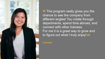 Over the course of 18 months, you will have the opportunity to learn new skills, develop yourself, and grow professionally. Based in what we call a “home market,” you will rapidly expand your network within both the local and global organization. You will explore different departments, participate in local and central projects, and spend 6 months in a different country.
