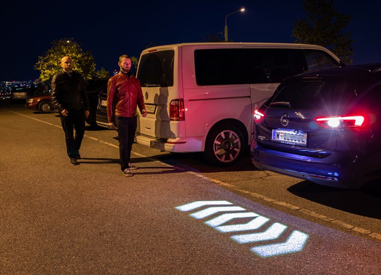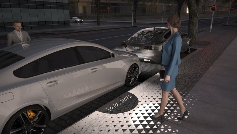 The powerful micro-LED module used for fully dynamic 360-degree near-field projection can project images onto the ground with a resolution of 16,000 pixels. The micro-LED chip has a theoretical maximum luminous flux of 10,000 lumens, which means that warnings can easily be seen in situations where safety is an issue, such as poorly lit parking garages or twilight. Aside from the question of performance, micro-LED technology is less complex in terms of optical layout and has a simple electronic system architecture. As a result, the micro-LED module along with all the other system-relevant components like the power supply and GPU can fit into a one-box solution measuring only 5 x 5 x 5 centimeters. “This makes integration in the vehicle very simple and opens up possibilities that go beyond safety,” says Maximilian Austerer. Once such a system is installed, many other applications relating to comfort and customer loyalty can easily be implemented, such as a light carpet to welcome the driver.
