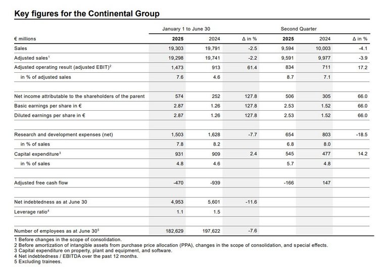 “We continue to see solid earnings in all areas. Our adjusted operating result and adjusted free cash flow increased year-on-year in the first half of 2025. Continental is on the right track – despite constantly changing conditions,” said Continental CFO Olaf Schick.