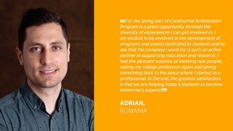 Naši ambasadoři jsou na svou práci ve společnosti Continental hrdí a rádi se o své zkušenosti dělí dál. Svému okolí předávají své know-how a odborné znalosti přátelským způsobem. Více informací o osobní motivaci našich ambasadorů najdete zde.