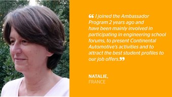 V oficiálním programu Continental Ambassador se v současnosti angažuje více než 1 000 našich kolegů. Na veletrzích, akcích nebo na sociálních sítích informují o svém pracovním životě, kariérní cestě a benefitech ve společnosti Continental. Působí jako mentoři studentských projektů, přednášejí na vysokých školách a univerzitách a reprezentují své oddělení na oborových setkáních. Potenciálním uchazečům a ambiciózním talentům mohou předat užitečné tipy pro výběrové řízení či samotný nástup do společnosti Continental.