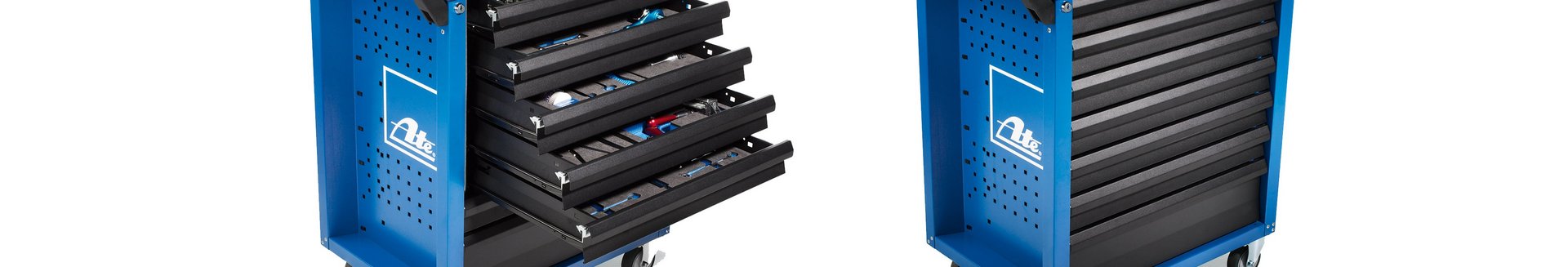 Der Wagen mit den Maßen H 915mm x B 780mm x T 496mm besitzt sieben auszugsichere Schubladen. Fünf davon sind mit ATE Bremsenwerkzeug bestückt und für den schnellen Einsatz thematisch geordnet: Von Demontage, Montage und Bremsleitung bördeln in Schublade eins über Kolbenrückstellwerkzeuge für Kombisättel und Standardbremssättel, Reinigungs- und Messwerkzeuge bis hin zum Pedalfeststeller und Werkzeugen zur Trommelbremsenreparatur im fünften Auszug. Zwei weitere Schubladen kann die Werkstatt selbst mit Werkzeugen befüllen und dort zum Beispiel Steckschlüssel, Schraubendreher oder ein Zangenset verstauen. Die Schubladen haben eine Größe von 527mm x 348mm und sind kompatibel zu werkstattüblichen Ordnungssystemen. Weichschaumeinlagen halten die Werkzeuge und kleinteiliges Zubehör griffbereit an ihrem festen Platz. Das sorgt für Ordnung. Denn wenn ein Teil fehlt, fällt das sofort auf. Zudem sind die Werkzeuge so beim Transport gut geschützt. Auf der stabilen Arbeitsfläche oben auf dem Wagen können kleinere Arbeiten an den Bremsenteilen direkt am Fahrzeug verrichtet oder Werkzeuge und Arbeitsmaterial abgelegt werden.