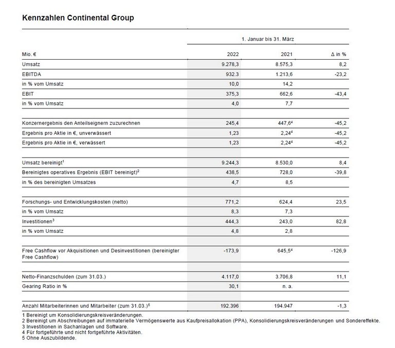 Im ersten Quartal 2022 erzielte Continental ein Nettoergebnis von 245 Millionen Euro (Q1 2021: 448 Millionen Euro für fortgeführte und nicht fortgeführte Aktivitäten). Der bereinigteFreeCashflow lag bei -174 Millionen Euro (Q1 2021: 646 Millionen Euro für fortgeführte und nicht fortgeführte Aktivitäten).