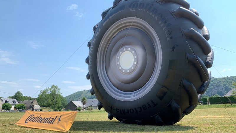Continental wirbt mit großem aufblasbaren Landwirtschaftsreifen entlang der Tour de France 2022