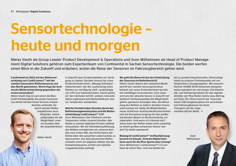 Das Whitepaper „Smarte Reifen – Digitale Lösungen für eine effiziente und nachhaltige Logistik“ lässt nationale und internationale Kunden zu Wort kommen, die bereits viele Jahre Erfahrung mit dem Einsatz digitaler Lösungen haben. Die Sensorexperten Niklas Vauth und Sven Wilhelmsen geben Einblick in ihre Arbeit und erläutern, wohin die Reise in der Sensortechnologie geht. Der Verband der Automobilindustrie (VDA) thematisiert, wie das Fahrzeug zum Kommunikationsknoten wird. Das Würzburger Institut für angewandte Logistik nennt konkrete Lösungen für eine nachhaltige Logistik. Das Potenzial von smarten Reifen für neue Mobilitätsformen durch das Zusammenspiel von Telematikdaten und Algorithmen beschreibt der Carsharing-Anbieter SHARE NOW Dänemark.