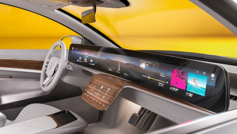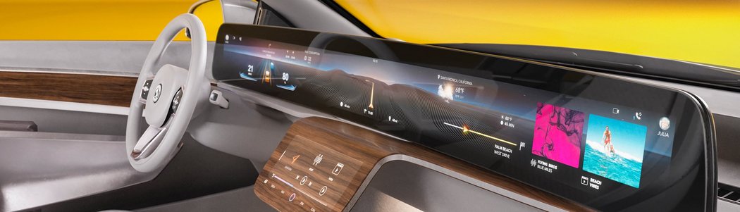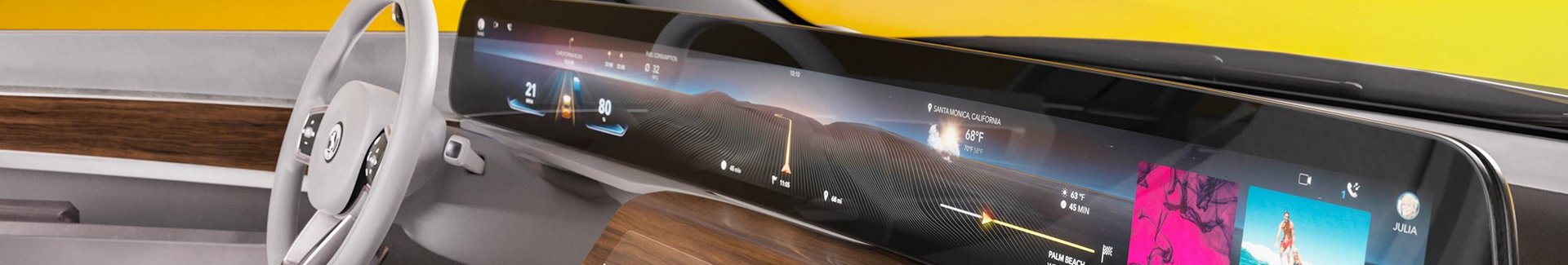 Das gewölbte Pillar-to-Pillar-Display ist Fahrer-, Zentral- und Beifahrer-Bildschirm in einem und bietet Designern die größtmögliche Freiheit, das Cockpit futuristisch und edel zu gestalten und die nahtlose Bildschirmfläche mit Inhalten zu bespielen. Die Wölbung mit einem Radius von 4.200 Millimetern integriert sich harmonisch in die ohnehin gerundete Fahrzeugfront und sorgt dafür, dass der Nutzer auch entfernte Bildschirmbereiche einsehen und das gebogene Display als entspannend für die Augen wahrnehmen kann. Das Bedienkonzept auf Basis eines unsichtbareren Displays, das sich in eine kontrastreiche, gut sichtbare Anzeige verwandelt, ermöglicht eine komfortable und sichere Interaktion. Die Serienproduktion des Curved Ultrawide Displays ist für 2025 geplant.