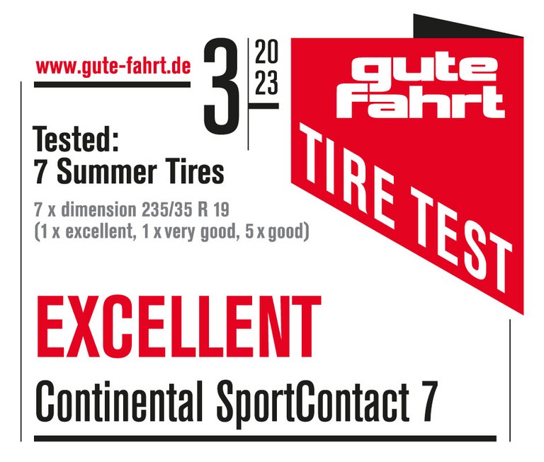 Hannover, 16. Februar 2023. Die Test-Reihe für Sommerreifen wird in diesem Jahr von der „Gute Fahrt“ angeführt. In ihrem aktuellen Heft (3/23) fährt der SportContact 7 mit dem Urteil „überragend“ auf den ersten Platz. Geprüft wurden sieben Reifenmodelle der Größe 235/35 R 19 europäischer, asiatischer und amerikanischer Hersteller. Testfahrzeuge waren ein Golf GTI sowie ein Cupra Leon TSI. Nach insgesamt neun Prüfungen auf trockenem und nassem Asphalt erfuhr sich der Sommerreifen von Continental die Note „überragend“ und „dominierte die Konkurrenz“, wie die Redaktion schreibt.