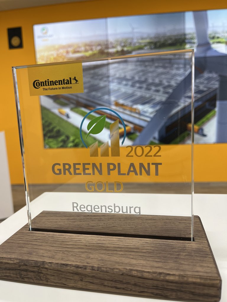 Regensburg, 19. April 2023. Heute ist Continental Regensburg offiziell das Green Plant Label Gold, ein internes Nachhaltigkeits-Zertifikat, überreicht worden. Als einer von zwei Continental-Standorten konnte Regensburg mit großem Engagement, Initiativen und technischen Lösungen die vielen Anforderungen erfüllen und wurde mit dem Prädikat „Gold“ ausgezeichnet. Bei der Auszeichnung handelt es sich um eine erfolgreiche Rezertifizierung. Regensburg erhielt als erster Continental-Standort weltweit bereits 2018 das Green Plant Label (GPL) Gold und konnte nun im Dezember 2022 die erneute Prüfung exzellent bestehen. Am heutigen Tag wurde die Auszeichnung offiziell an den Standort übergeben.