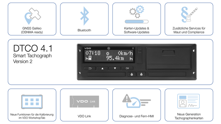 Eine der wichtigsten Aufgaben des neuen DTCO 4.1 ist die verbesserte Dokumentation von Kabotagefahrten und Fahrerentsendungen. Hierfür werden die Fahrzeugposition und Grenzübertritte über ein GNSS-Modul (Globales Navigationssatellitensystem) automatisch erkannt und im Massenspeicher erfasst. Eine Bluetooth-Schnittstelle sorgt für mehr Konnektivität, sodass das Auslesen und Steuern des Tachographen über externe Geräte wie Smartphones problemlos möglich ist. Zudem ist der DTCO 4.1 schon heute geeignet für die neuen Fahrerkarten mit ihrer von 28 auf 56 Tage erweiterten Speicherkapazität, die Ende 2024 verpflichtend wird. Die Sicherheit der Daten gewährleistet das gesetzlich geforderte Sicherheitszertifikat gemäß ISO/IEC-15408-Standard mit der Prüftiefe EAL 4+ (Evaluation Assurance Level). Der DTCO 4.1 verwendet schon heute die Daten des europäischen Satellitennavigationssystems Galileo, welche in Zukunft ein weiteres Plus in Sachen Datensicherheit bieten werden. „Wir hatten gehofft, dass uns der Betreiber die Authentifizierung der Galileo-Positionsdaten schon zum Marktstart im August zur Verfügung stellen würde“, erklärt Matthias Kliché, Head of Legal Requirements im Geschäftssegment Connected Commercial Vehicle Solutions. „Weil das nicht möglich war, freuen wir uns, dass die Europäische Kommission durch die kürzlich verabschiedete Regulation (EU 2023/980) im Sinne aller Beteiligten für Rechtssicherheit in dieser Übergangsphase gesorgt hat.“