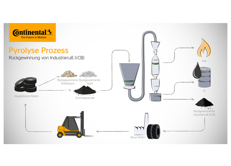Gemeinsam mit ihrem Partner Pyrum Innovations entwickelt Continental derzeit Verfahren, um das Recycling von Altreifen durch Pyrolyse weiter zu optimieren und auszubauen. So soll rückgewonnener Industrieruß künftig bei immer mehr Gummimischungen von Continental eingesetzt werden. Pyrum verarbeitet Altreifen mit ihrer patentierten Pyrolyse-Technologie in ihre einzelnen Bestandteile. Auf diese Weise können wertvolle Rohstoffe aus Altreifen gewonnen und wiederverwertet werden. Dabei handelt es sich vor allem um Öl, Gas und Industrieruß. Das zurückgewonnene Öl kann unter anderem für die Herstellung von Chemikalien wiederverwendet werden. Hierfür würde sonst Rohöl verwendet werden. Wiedergewonnenes Gas dient unter anderem als Energiequelle für den Pyrolyse-Prozess.