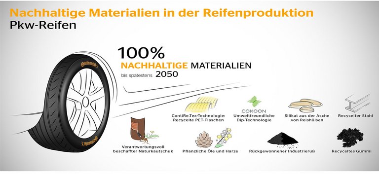 - Reifenhersteller verbaut heute schon Silika aus der Asche von Reishülsen, Industrieruß aus Altreifen und Polyester aus recyceltem PET in Serienreifen