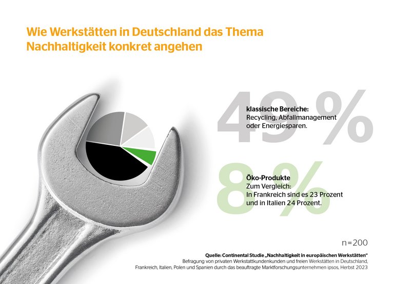 Frankfurt, 10. April 2024. Beim Thema Nachhaltigkeit setzen freie Werkstätten in Deutschland vor allem auf die „klassischen“ Maßnahmen Recycling, Abfallmanagement und Energiesparen. Der Einsatz umweltfreundlicher Ersatzteile spielt dagegen noch eine untergeordnete Rolle, Nachhaltigkeit als möglicher Umsatzbringer steht kaum im Fokus. Dabei spielt für einen nicht unerheblichen Teil der Kunden das Thema eine Rolle bei der Werkstattwahl, und eine klare Mehrheit möchte zu nachhaltigen Produkten beraten werden. Zu diesen Ergebnissen kommt die Continental Studie „Nachhaltigkeit in europäischen Werkstätten“. Das Marktforschungsinstitut Ipsos hat dazu im Auftrag von Continental insgesamt 1.000 freie Werkstätten und 5.000 private Werkstattkunden in Deutschland, Frankreich, Italien, Polen und Spanien befragt. Auf die Frage, wie die Werkstätten in Deutschland sich mit Nachhaltigkeit auseinandersetzen, nennen die befragten Werkstattinhaber oder Service-/Werkstattleiter am häufigsten das Recycling von Teilen, Verpackungen und Flüssigkeiten (25 Prozent), Müllvermeidung und Abfallmanagement (13 Prozent) sowie Energiesparen (11 Prozent). Der Einsatz umweltfreundlicher Produkte (8 Prozent) liegt in Deutschland nicht so sehr im Fokus wie etwa bei den Spitzenreitern Frankreich (23 Prozent) oder Italien (24 Prozent). Und das, obwohl 71 Prozent der Werkstätten in Deutschland durchaus Wachstumspotenzial bei Öko-Produkten sehen.