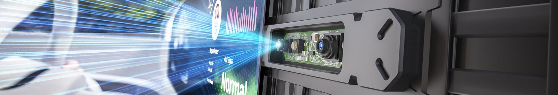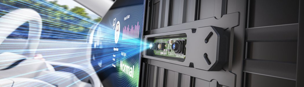 Um Vitaldaten zu erfassen ist neben einer 1,5-MP-Near Infrared-Kamera ein für das menschliche Auge ungefährlicher Laser Dot Projector hinter dem hochauflösenden OLED-Bildschirm platziert. Die hier eingesetzte biometrische Bildanalyse stammt vom Technologiepartner trinamiX. Das Verfahren nutzt die Reflexionen der vom Laser Dot Projector im unsichtbaren Lichtspektrum ausgesendeten Lichtpunkte, um auf Basis von künstlicher Intelligenz Ergebnisse abzuleiten. Zudem stellt die Lösung weitere relevante Informationen bereit: den Abstand von Fahrerin oder Fahrer zum Cockpit oder auch die Klassifikation von Textilstoffen, die zur Erkennung eines korrekt angelegten Sicherheitsgurtes benötigt wird.