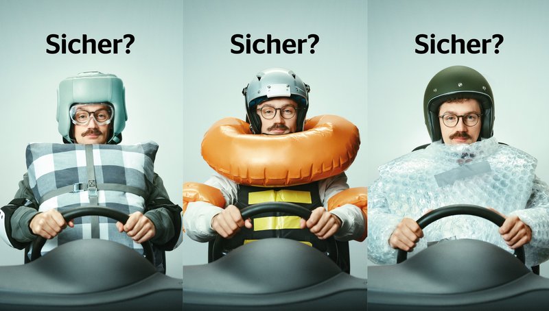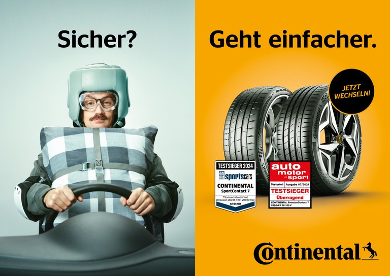 Durch den kreativen Kampagnenansatz verdeutlicht der Reifenhersteller die besonders einfache Wahl, mit Reifen von Continental sicher unterwegs zu sein. Die Motive kontrastieren übermäßige Sicherheitskleidung mit der prägnanten Botschaft: „Sicher? Geht einfacher.“