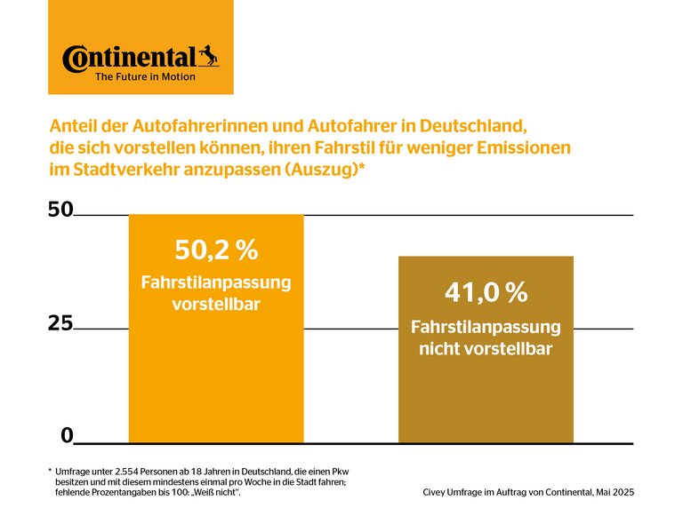Hannover, 21. Juli 2025. Unterwegs in der Stadt, aber auf das Auto angewiesen? Sei es aufgrund der Ladung im Kofferraum oder des Alltags mit den Kindern – der ÖPNV, das Fahrrad oder andere umweltverträglichere Verkehrsmittel sind nicht immer eine geeignete Option. Dennoch lassen sich die CO2-Emissionen auch von Autofahrerinnen und Autofahrern senken. Denn: Der eigene Fahrstil gehört zu den Faktoren mit den größten Auswirkungen auf den CO2-Ausstoß eines Pkw.[1] Insbesondere in Städten, in denen es zur Rushhour häufig zu Stop-and-go-Verkehr kommt, kann der Umweltbelastung durch vorausschauendes und gleichmäßiges Fahren entgegengewirkt werden. Leider können sich zwei von fünf (41 Prozent) Autofahrerinnen und Autofahrer in Deutschland nicht vorstellen, ihren Fahrstil aktiv anzupassen, um so den CO2-Ausstoß ihres Fahrzeugs im Stadtverkehr zu reduzieren. Das hat Civey im Auftrag des Reifenherstellers Continental in einer repräsentativen Umfrage unter rund 2.500 Autobesitzern in Deutschland, die mindestens einmal pro Woche in die Stadt fahren, herausgefunden.[2] Immerhin: Die Hälfte der Befragten (50 Prozent) kann sich vorstellen, ihre Fahrweise zu verändern, um weniger CO2 zu produzieren.[3]