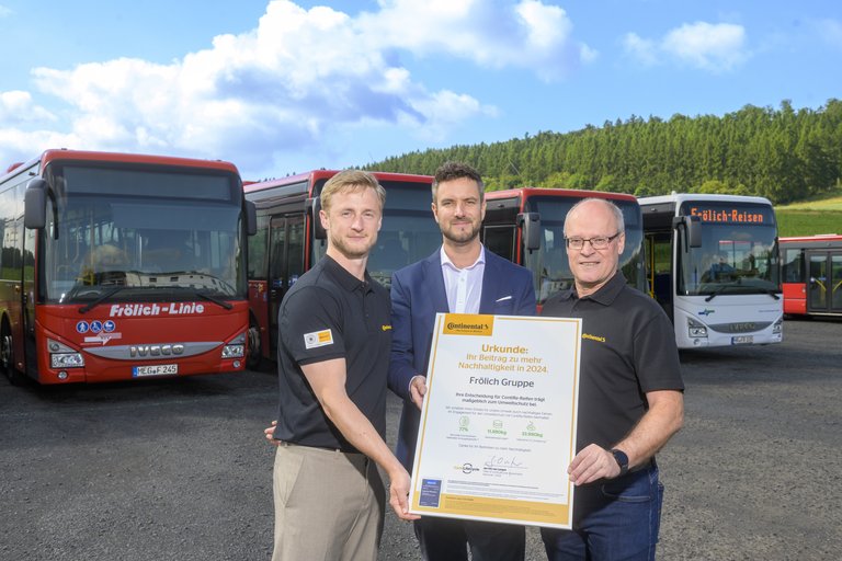 Die Frölich-Reisen GmbH, ein in fünfter Generation familiengeführtes Verkehrs- und Reiseunternehmen mit Sitz in Nordhessen, setzt seit 2020 auf die Reifen und Services von Continental und seit 2023 auf das ContiLifeCycle-Konzept. Durch den Einsatz von runderneuerten Reifen für die unternehmenseigene Linienbusflotte, die im öffentlichen Personennahverkehr Fahrgäste im Nordhessischen Verkehrsverbund befördert und dabei jedes Jahr pro Bus ca. 80.000 Kilometer zurücklegt, konnte Frölich-Reisen im Jahr 2024, zum Beispiel, 33 Tonnen CO2 einsparen. Continental stattet insgesamt 128 Linienbusse von Frölich-Reisen mit ContiRe-Reifen aus. „Dank der Continental-Urkunde inklusive TÜV-Siegel können wir unsere Nachhaltigkeitsbemühungen in Sachen Reifen nun auch belegen,“ sagt Konstantin Frölich, Geschäftsführer von Frölich-Reisen. „Das ist ein wichtiger Faktor, um mit möglichst geringen Umweltbelastungen den lokalen Linien- und Personennahverkehr weiter zu stärken und so noch attraktiver zu machen.“