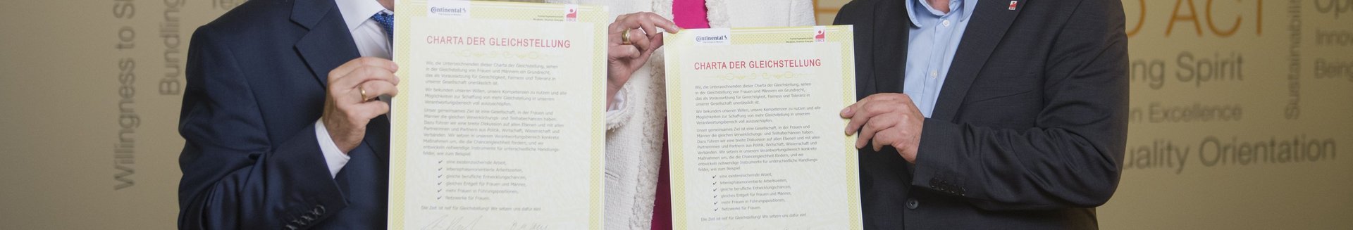 Hannover, 20. September 2016. Mit der Unterzeichnung der „Charta der Gleichstellung“ hat sich das Technologieunternehmen Continental am 20. September 2016 erneut öffentlich zu Vielfalt, Fairness und Respekt im Umgang mit Mitarbeitern bekannt. Die Ziele der Charta decken sich mit den von Continental seit Jahren bearbeiteten, zentralen Handlungsfeldern. Einige davon sind in der Tarifbindung festgeschrieben. Dazu zählen Entgeltgleichheit, existenzsichernde Arbeitsplätze und gleiche berufliche Entwicklungschancen für Frauen und Männer sowie Arbeitszeiten, die sich an Lebensphasen orientieren. Continental bietet durch unterschiedliche Arbeitsformen zusätzliche Möglichkeiten der Arbeitsgestaltung, wie zum Beispiel durch das Einrichten von mobilem Arbeiten, Home Office oder Langzeitkonten. Diese Modelle baut Continental weiter aus.