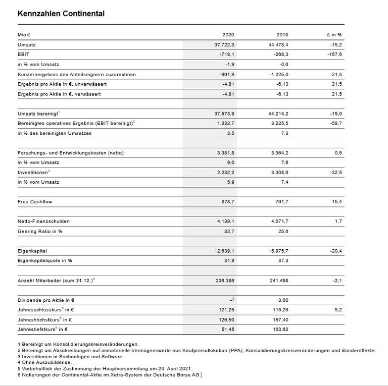 Continental erzielte im abgelaufenen Geschäftsjahr ein operatives Ergebnis in Höhe von -718 Millionen Euro sowie ein Nettoergebnis von -962 Millionen Euro. Gründe hierfür waren neben der rückläufigen Umsatzentwicklung insbesondere bereits im Oktober 2020 berichtete und im dritten Quartal gebuchte, nicht zahlungswirksame Wertminderungen von Goodwill in Höhe von 649 Millionen Euro (31. Dezember 2020: 655 Millionen Euro) infolge angepasster Marktannahmen. Hinzu kommen 2020 Aufwendungen sowie Wertminderungen auf Sachanlagen in Höhe von insgesamt 998 Millionen Euro, die im Wesentlichen im Rahmen des Strukturprogramms angefallen sind. Auf dieser Basis sowie gemäß der Dividendenpolitik des Unternehmens (d.h. Ausschüttung zwischen 15 und 30 Prozent des Nettoergebnisses) hat der Vorstand – wie bereits mitgeteilt – beschlossen, der diesjährigen Hauptversammlung vorzuschlagen, auf die Ausschüttung einer Dividende für das Geschäftsjahr 2020 zu verzichten.