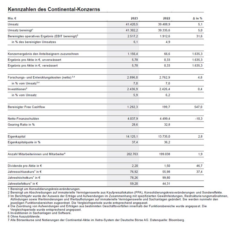 Im abgelaufenen Geschäftsjahr erreichte Continental einen Konzernumsatz von 41,4 Milliarden Euro (2022: 39,4 Milliarden Euro, +5,1 Prozent). Das bereinigte operative Ergebnis belief sich auf 2,5 Milliarden Euro (2022: 1,9 Milliarden Euro, +31,6 Prozent). Das entspricht einer bereinigten EBIT-Marge von 6,1 Prozent (2022: 4,9 Prozent). Zur Verbesserung der bereinigten EBIT-Marge trugen alle drei Unternehmensbereiche bei.