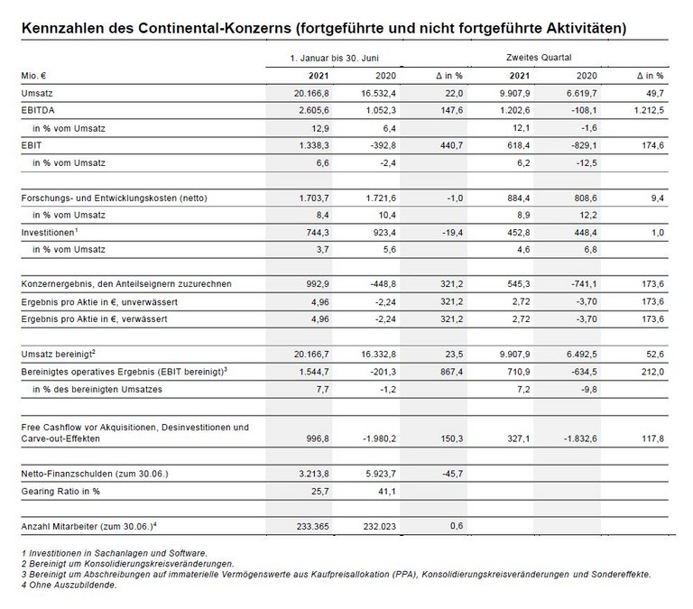 Hannover, 5. August 2021. Angesichts der anhaltenden makroökonomischen Herausforderungen hat Continental im zweiten Quartal 2021 ein respektables Ergebnis erzielt. Während das Geschäft im Unternehmensbereich Automotive Technologies durch die fortdauernden Engpässe bei Elektronikbauteilen beeinträchtigt wurde, legte der Unternehmensbereich Rubber Technologies insbesondere durch das gute Reifengeschäft starke Zahlen vor.