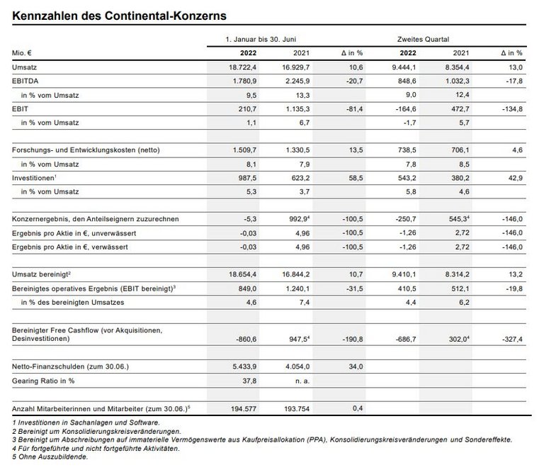 „Der aktuelle Gegenwind ist orkanartig und wird kurzfristig nicht abflauen. In diesem Umfeld haben wir uns gut behauptet und unsere Widerstandskraft erhöht. Mit dem aktuellen Ergebnis sind wir nicht zufrieden – auch wenn wir es so erwartet hatten. Für das zweite Halbjahr sind wir hingegen zuversichtlich. So rechnen wir mit einer steigenden Automobilproduktion. Zudem greifen unsere Maßnahmen zur Verbesserung des Ergebnisses. Wir halten daher an unserem Ausblick auf das laufende Geschäftsjahr fest“, sagte Katja Dürrfeld, Finanzvorständin von Continental. Im zweiten Halbjahr rechnet Continental mit einer Stabilisierung der weltweiten Lieferketten, einer leichten Verbesserung der Verfügbarkeit von Halbleitern sowie weiterhin einer stabilen Energieversorgung in Europa und insbesondere in Deutschland.