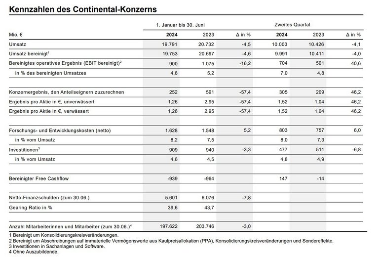 Im zweiten Quartal 2024 erzielte Continental einen Konzernumsatz von 10,0 Milliarden Euro (Q2 2023: 10,4 Milliarden Euro, -4,1 Prozent). Das bereinigte operative Ergebnis stieg auf 704 Millionen Euro (Q2 2023: 501 Millionen Euro, +40,6 Prozent). Dies entspricht einer bereinigten EBIT-Marge von 7,0 Prozent (Q2 2023: 4,8 Prozent).