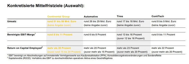 Aufgrund dieser starken Positionierung im Markt strebt der Unternehmensbereich Tires mittelfristig einen Umsatz von rund 17 bis 18 Milliarden Euro sowie eine bereinigte EBIT-Marge von rund 13 bis 16 Prozent an. Neben der Erholung der aktuell schwachen Nachfrage insbesondere im europäischen Reifenersatzgeschäft bilden dafür kontinuierliche Effizienzsteigerungen, der weiter anhaltende Trend zu größeren und leistungsfähigeren Reifen sowie eine hohe Kostendisziplin die Basis für die erwarteten Umsatz- und Margensteigerungen. Starkes Wachstumspotenzial sieht der Reifenbereich vor allem in den Regionen Asien-Pazifik sowie Nord- und Südamerika.