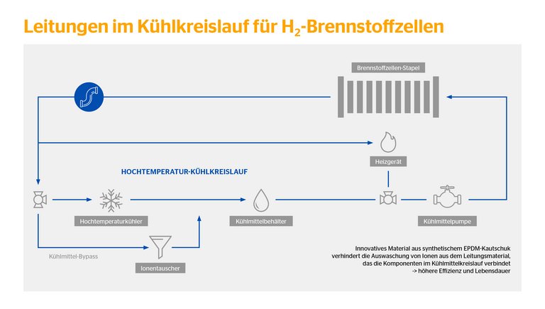 Für die Kühlung im Wasserstoffkreislauf von Nutzfahrzeugantrieben setzt Continental deshalb auf eine Mischung aus synthetischem Kautschuk. Konkret handelt es sich um eine spezielle Mischung auf der Basis eines Hochleistungs-EPDM (Ethylen-Propylen-Dien-Kautschuk), das für die gewünschte hohe Beständigkeit gegenüber der unerwünschten Auswaschung von Ionen sorgt.