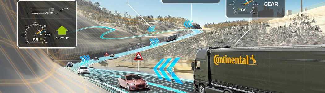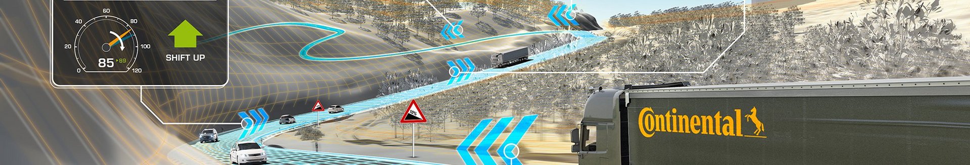 Die nächste Generation des elektronischen Horizonts, der dynamische eHorizon, ermöglicht zusätzliche Einsparpotenziale – noch einmal bis zu zwei Prozent im Vergleich zum Vorgängermodell. In dieser Ausbaustufe wird das digitale Kartenmaterial durch die Vernetzung mit der Cloud nahezu in Echtzeit aktualisiert und liefert so korrekte und aktuelle Daten zur gegenwärtigen Verkehrslage. Das erhöht nicht nur zusätzlich die Sicherheit, da das Fahrverhalten frühzeitig an die aktuelle Verkehrssituation angepasst werden kann. Der eHorizon wird damit auch zu einer wichtigen Basis für das automatisierte Fahren. Continental testet den dynamischen eHorizon aktuell in verschiedenen Vorentwicklungsprojekten speziell für Nutzfahrzeuge.