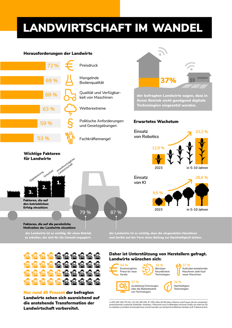 Insgesamt wurden 503 Landwirte aus den fünf Kernmärkten Brasilien (n=100), Deutschland (n=100), Frankreich (n=101), Japan (n=100) und den USA (n=102) befragt, die selbst Anwender:innen von landwirtschaftlichen Geräten sind und in Betrieben mit einer Größe von mehr als 30 Hektar arbeiten.