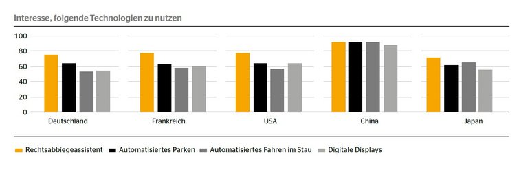 Zwar möchten auch in Deutschland, den USA, Japan und Frankreich mehr als die Hälfte der Befragten diese Technologie in naher Zukunft nutzen, aber in diesen Ländern wird die Entscheidung in einem größeren Maße abhängig gemacht vom Preis des Assistenzsystems. In China spielt dies nur für 5 Prozent aller Befragten eine Rolle, in Japan sind es hingegen 21 Prozent.