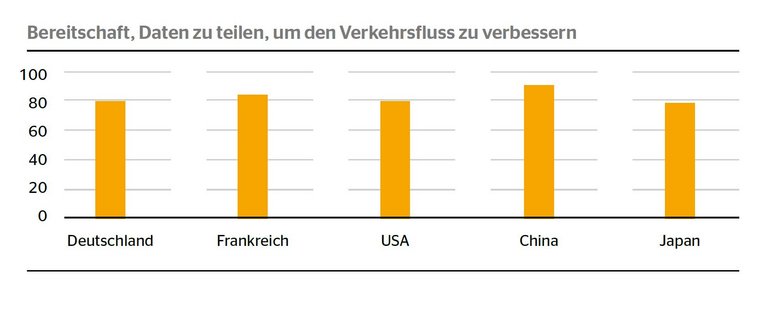 In den befragten Ländern Deutschland, Frankreich, USA, Japan und China sind Autofahrer mehrheitlich gern bereit, die Speicherung, Weitergabe und Verarbeitung von Fahrdaten und persönlichen Daten zu akzeptieren, wenn dies der Aufklärung eines Unfalls oder der Verbesserung des Verkehrsflusses dient. Diese Einstellung ist über die Länder hinweg auch stabil: Im Vergleich zur Befragung im Jahr 2018 sind die Zustimmungsraten unverändert geblieben.