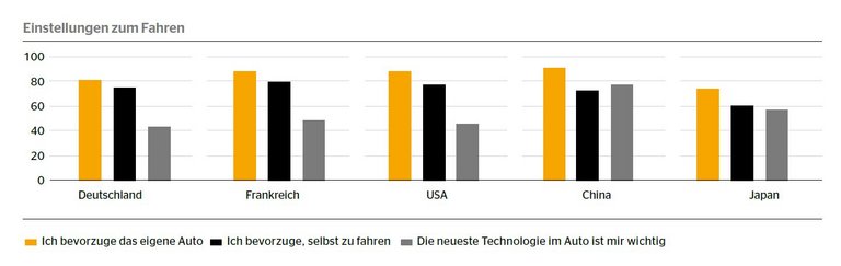 An genereller Technologieoffenheit mangelt es den Menschen in den fünf befragten Ländern also nicht, sich auf neue Entwicklungen der automobilen Mobilität einzulassen. Die traditionelle Sicht aufs Autofahren – selbstfahrend und im eigenen Auto – weist aber darauf hin, dass neue Formen der Mobilität noch an Akzeptanz gewinnen müssen, um weite Verbreitung zu finden. Dies gilt für Sharing-Modelle genauso wie für das autonome Fahren.