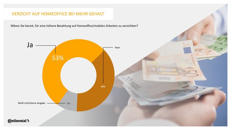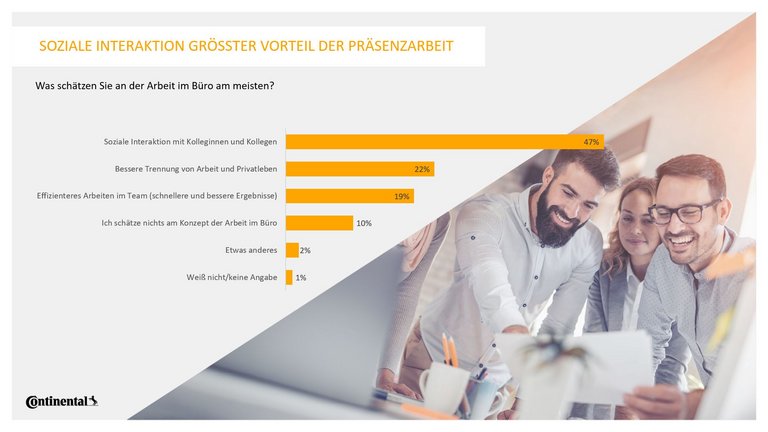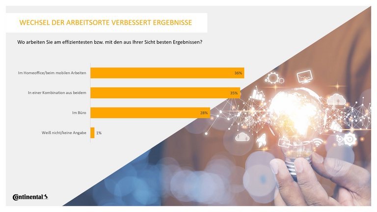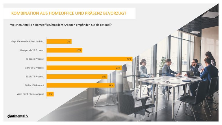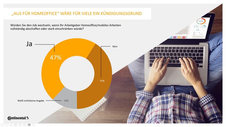 Knapp die Hälfte (47 Prozent) der Büroangestellten in Deutschland würde kündigen, wenn ihr Arbeitgeber die Möglichkeit von Homeoffice oder mobilem Arbeiten vollständig abschaffen oder stark einschränken würde. Das ist das Ergebnis einer repräsentativen Umfrage, die das Meinungsforschungsinstitut YouGov im Auftrag von Continental unter mehr als 2.000 Büroangestellten durchgeführt hat.