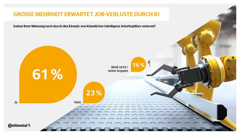 Knapp zwei Drittel der Deutschen (61 Prozent) fürchten, dass durch den Einsatz von Künstlicher Intelligenz Arbeitsplätze verloren gehen könnten. Das ist das Ergebnis einer repräsentativen Umfrage, die das Meinungsforschungsinstitut YouGov im Auftrag von Continental unter rund 2.000 Bundesbürgerinnen und Bundesbürgern zwischen dem 28. Februar und dem 1. März 2023 durchgeführt hat. Hier finden Sie alle Grafiken im Überblick.