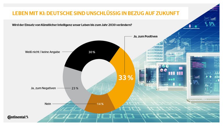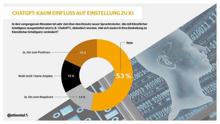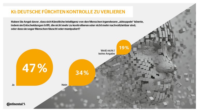 Knapp zwei Drittel der Deutschen (61 Prozent) fürchten, dass durch den Einsatz von Künstlicher Intelligenz Arbeitsplätze verloren gehen könnten. Das ist das Ergebnis einer repräsentativen Umfrage, die das Meinungsforschungsinstitut YouGov im Auftrag von Continental unter rund 2.000 Bundesbürgerinnen und Bundesbürgern am 28. Februar und 1. März 2023 durchgeführt hat. Der Umfrage zufolge hat fast die Hälfte der Befragten (47 Prozent) Angst, dass sich Künstliche Intelligenz von den Menschen „abkoppeln“ könnte, indem sie Entscheidungen trifft, die nicht mehr zu kontrollieren oder nicht mehr nachvollziehbar sind. Insgesamt 45 Prozent der Deutschen stehen dem Einsatz von Künstlicher Intelligenz skeptisch gegenüber. 10 Prozent lehnen die Technologie generell ab. „Grundsätzlich positiv“ bewerten 36 Prozent der Befragten die KI.