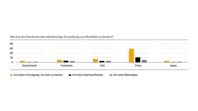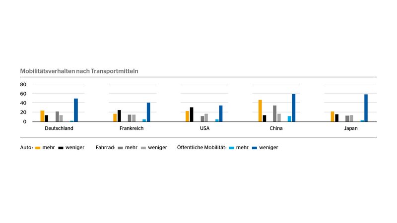 Die Frage ist, ob sich der Wunsch nach individueller Mobilität auch nach der Krise verstetigt. Einige Ergebnisse deuten dies an: Zwischen 6 Prozent (Japan und Deutschland) und 15 Prozent (USA) der Befragten berichten nämlich, dass sie ein Auto gekauft haben oder dies in Betracht ziehen – eine mittel- bis langfristig ausgerichtete Entscheidung. In China, wo der Anteil der Autobesitzer noch deutlich geringer ist, sind es sogar 58 Prozent der Befragten.
