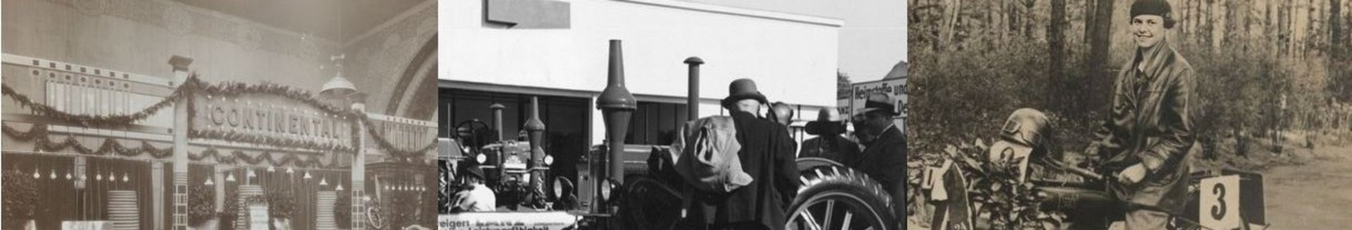 Ines Keil-Folville (Mitte): Auf Continental-Reifen bestritt die frühe Profirennfahrerin 1925 in Deutschland die 24-Stunden-Zuverlässigkeitsfahrt im hessischen Taunus. Keil-Folville gewann das Rennen nicht nur – sie war auch die einzige Frau, die daran teilnahm.
