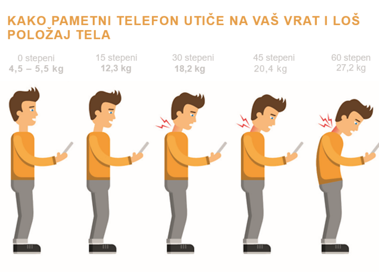 Fizičke tegobe, kao što je oštećenje oka uzrokovano osetljivošću na svetlinu ekrana i bolovima u vratu usled lošeg položaja tokom upotrebe pametnog telefona, prilično su štetne po zdravlje. Na primer, glava odrasle osobe teži oko šest kilograma, ako stojimo uspravno, upravo ta težina spušta našu kičmu. Međutim, čak i pod nagnutim uglom od 15 stepeni, sila na kičmi se udvostručuje. Ako sagnemo glavu napred za 60 stepeni, ona se čak povećava na 27 kilograma - 4,5 puta više od stvarne težine glave. Što dublje glava tone napred, to je veće opterećenje na nju. Shodno tome, preporučuje se što je moguće manji stepen difrakcije glave.