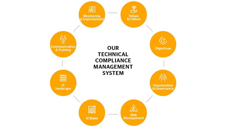 This means we constantly monitor the technical Compliance of our products (system, hardware, software, services) and our technical Compliance Management System to permanently improve effectiveness and efficiency. Clearly defined roles and responsibilities for technical Compliance and a robust IT landscape are the main pillar of the system.