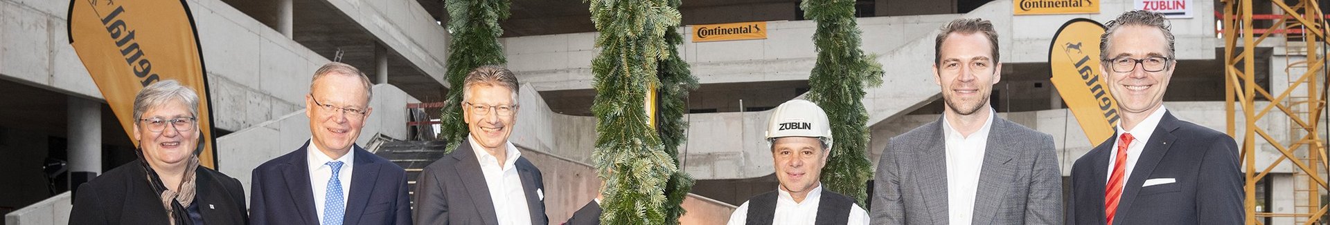 Hanover, November 6, 2019. The future is taking shape: 15 months after the ground-breaking ceremony, on Wednesday Continental held the topping-out ceremony for its new corporate headquarters on Hans-Böckler-Allee in Hanover. During the ceremony, Continental CEO Dr. Elmar Degenhart expressed his satisfaction with the progress of construction: “We are right on schedule. The plan is to have our new headquarters ready for occupancy in time for the company‘s 150th anniversary in 2021.” The 300 or so guests included Lower Saxony’s Minister President Stephan Weil, the First City Councilor and Director of Economic and Environmental Affairs of the City of Hanover, Sabine Tegtmeyer-Dette, along with planners and numerous workers from the participating construction companies and Continental employees.