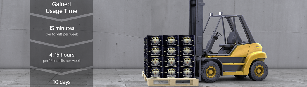 Since 2012, Krombacher has been relying on pneumatic tires from Continental. Pneumatic tires offer a decisive advantage over solid rubber tires: Under continuous load, as in the case of Krombacher, where they are lifted, stacked and turned almost around the clock, they do not heat up as much as their counterparts made of 100% rubber. Failures due to overheated tires are reduced to practically zero. However, the risk of flat tires increases on the premises of the brewery, due to shards lying around and the resulting loss of air pressure. Until 2017 Krombacher therefore carried out manual check-ups. Each forklift truck stood still for 15 minutes each week - for 17 forklifts that is 4 hours and 15 minutes a week, or almost ten production days per year.