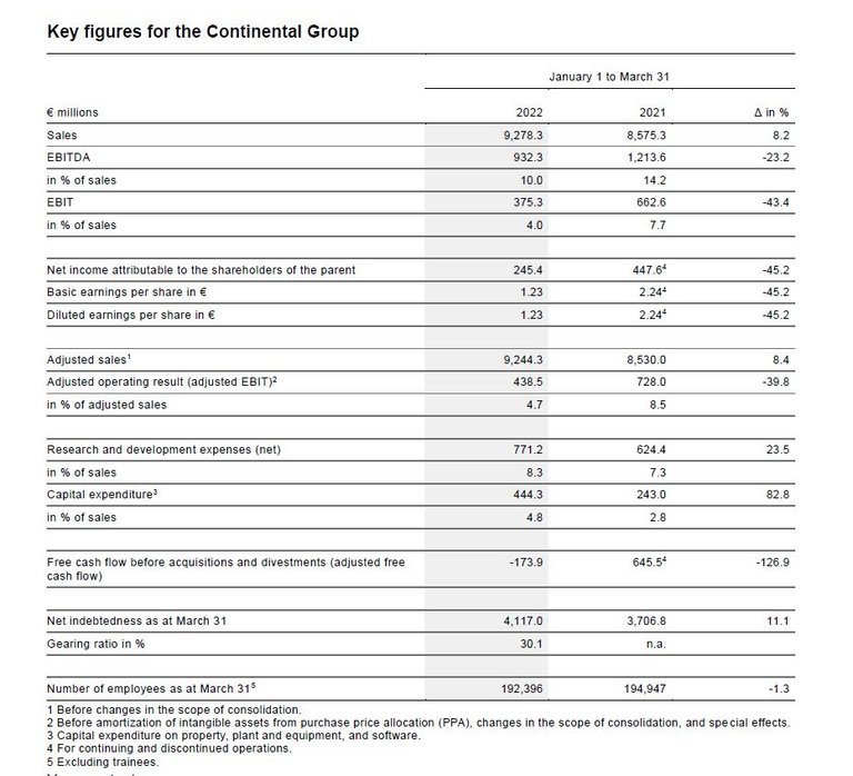 In the first quarter of 2022, Continental generated a net income of €245 million (Q1 2021: €448 million for continuing and discontinued operations). Adjusted free cash flow was -€174 million (Q1 2021: €646 million for continuing and discontinued operations).