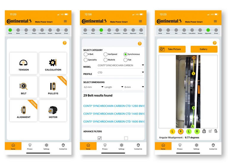 “Make Power Smart” consists of various modules with special functions: Gathering information on the spot, identifying and selecting the best belt according to the requirements, measuring drive geometry such as center distance, pulley diameter and wrap angle, checking drive alignment, calculating drive systems, and checking and setting the correct tension, which is analyzed by the smartphone's built-in microphone. This allows Continental's customers to make adjustments on their own in no time, instead of having to hire an external team for troubleshooting.