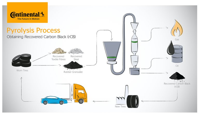 Continental is aiming for fully circular operations in its tire production by 2050 at the latest. In addition to the use of renewable materials, the company is working systematically on using recycled raw materials in tire production. This is intended to ensure that carbon black – another crucial filler in rubber compounds – can be obtained on a large scale in the future. Continental recently signed a development agreement with Pyrum Innovations with a view to further optimizing the recycling of materials from old tires. To do this, Pyrum breaks the old tires down into their constituent parts in an industrial furnace using a special pyrolysis process. In this way, valuable raw materials contained in end-of-life tires can be extracted and recycled. Both companies are working towards obtaining high-quality raw materials from the pyrolysis oil obtained for Continental's tire production in the medium term, in addition to the direct use of high-quality carbon black. In the long term, the premium tire manufacturer and Pyrum are aiming to establish a closed-loop circular economy concept for the recycling of old tires.