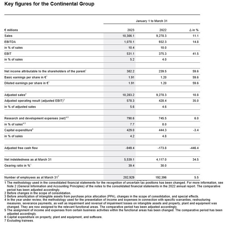 In the first quarter of 2023, Continental achieved consolidated sales of €10.3 billion (Q1 2022: €9.3 billion, +11.1 percent). Its adjusted operating result (adjusted EBIT) was €578 million (Q1 2022: €428 million, +35.0 percent), corresponding to an adjusted EBIT margin of 5.6 percent (Q1 2022: 4.6 percent).