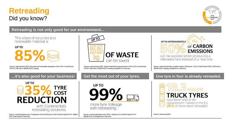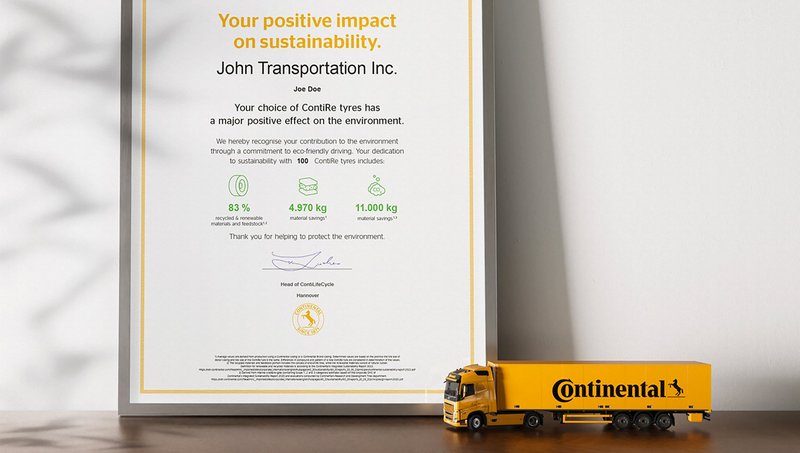 Hanover, November 02, 2023. Continental is presenting its fleet customers with an effective portfolio of solutions for making fleet operations efficient and sustainable. Fleet operators can choose from a modular range of solutions thanks to the Lowest Overall Driving Costs (LODC) comprehensive consultancy approach including ContiLifeCycle and ContiConnect digital tire management. The premium tire maker is now also providing operators with a certificate as proof of how they are helping to drive sustainability. “Taking as a basis the ContiRe tires fitted to the vehicles, we are able to calculate the material and carbon savings achieved during the course of production and retreading,” explains Siljana Lietz, Head of ContiLifeCycle at Continental Tires Germany. A study conducted by the Fraunhofer Institute for Environmental, Safety and Energy Technology (UMSICHT) showed that the carbon emissions of retreads are up to around 50 percent lower compared to similar new tires. Plus, recycled and renewable materials account for as much as 85 percent of a retreaded tire. “We devised the certificate at the request of our customers, whose day-to-day business increasingly calls for evidence of their efforts to improve sustainability and look after our planet’s resources.” The whole sustainability issue and climate-neutral transport are constantly gaining in importance in the logistics sector – a trend driven not least by tightly defined statutory requirements.