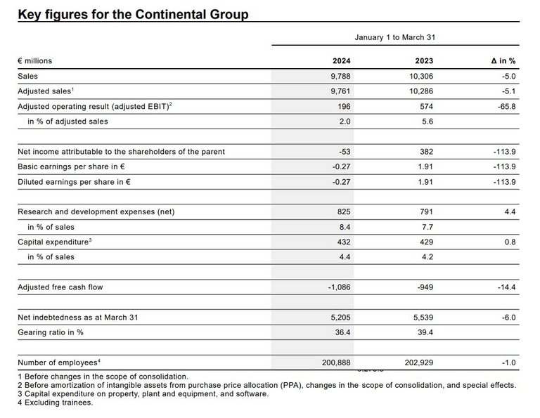 In the first quarter of 2024, Continental achieved consolidated sales of €9.8 billion (Q1 2023: €10.3 billion, -5.0 percent). Its adjusted operating result was €196 million (Q1 2023: €574 million, -65.8 percent), corresponding to an adjusted EBIT margin of 2.0 percent (Q1 2023: 5.6 percent).
